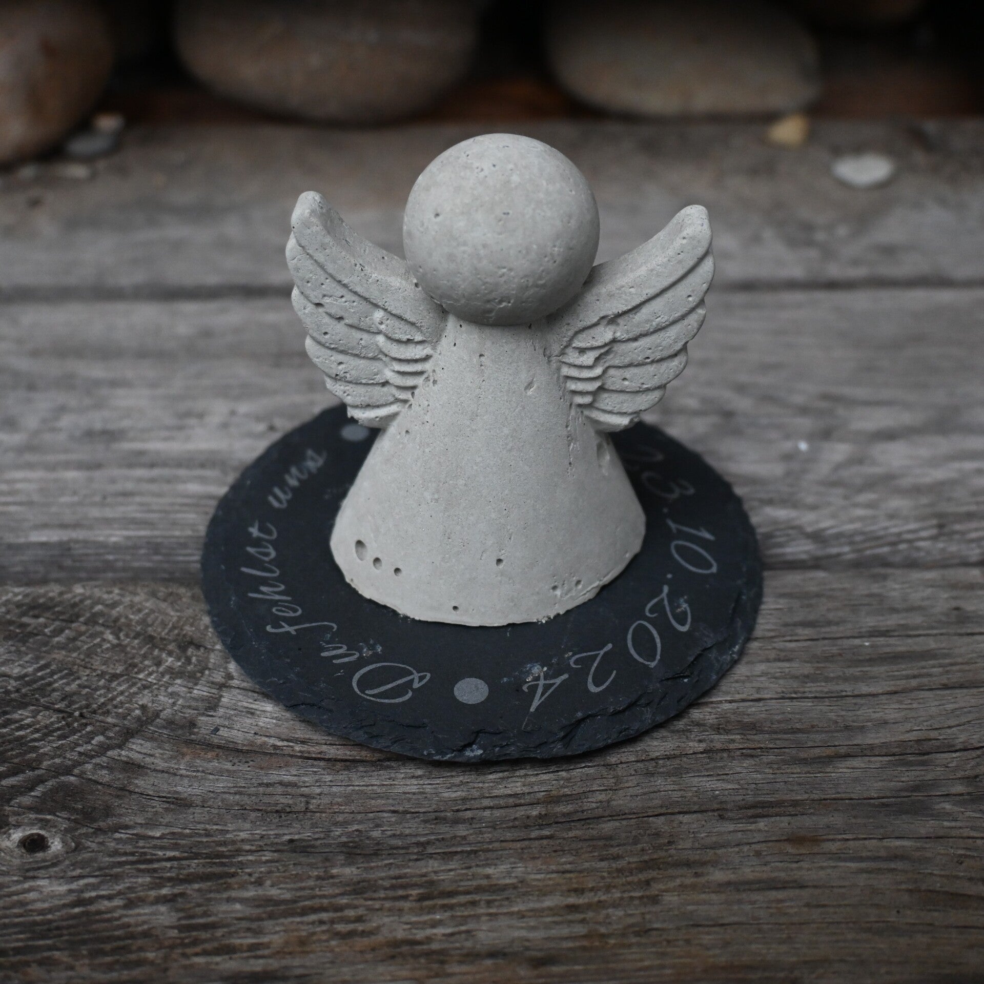 Die Schieferplatte (ca 10cm Durchmesser) wird nach Wunsch graviert. Zudem kannst Du einen von drei Engeln auswählen, der auf der Schieferplatte befestigt ist. Somit liefern wir eine persönliche und einzigartige Grabdekoration.
